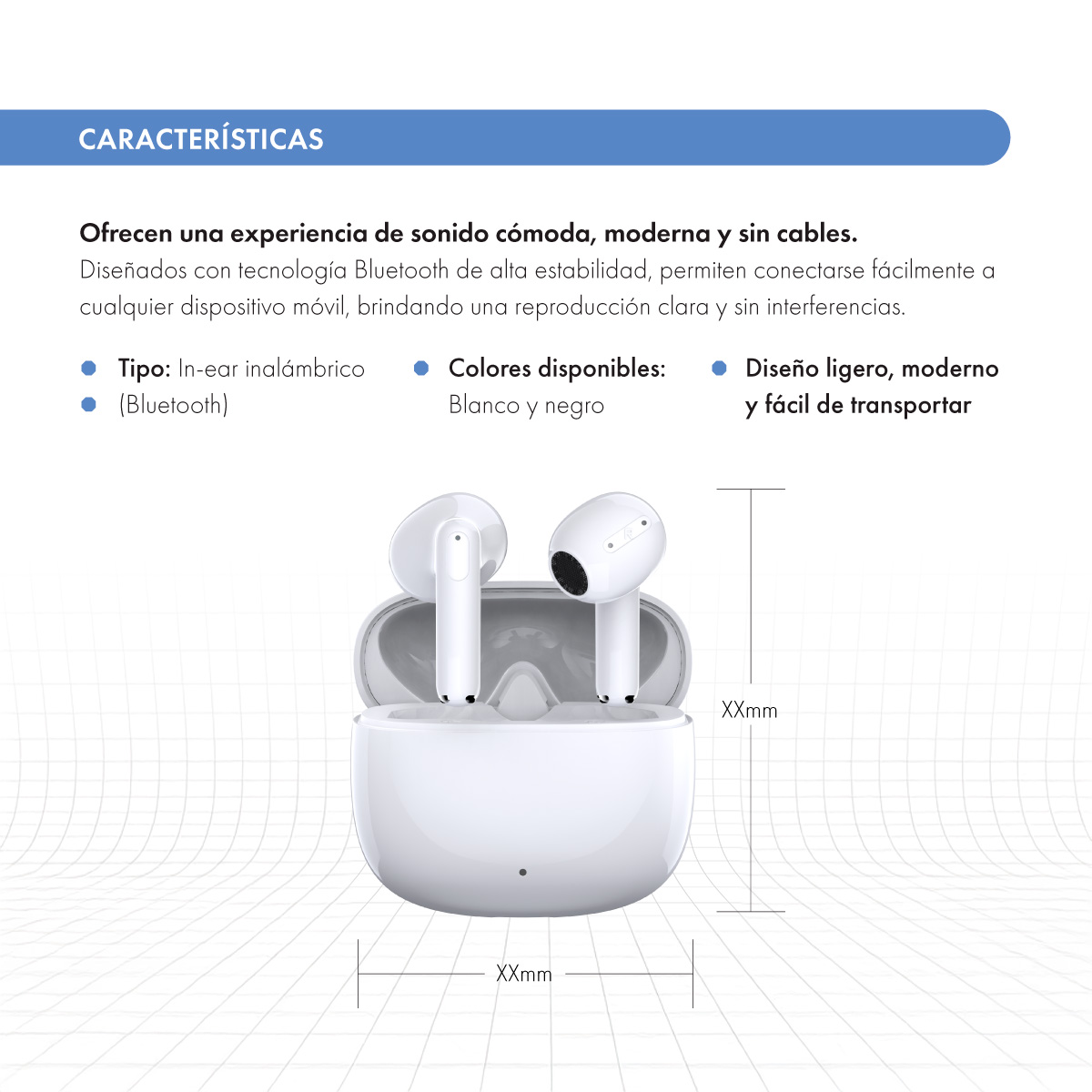 Su diseño in-ear ergonómico se adapta perfectamente al oído, brindando ajuste seguro, aislamiento del ruido y confort prolongado, ideales para disfrutar música, realizar llamadas o acompañarte en tus entrenamientos.