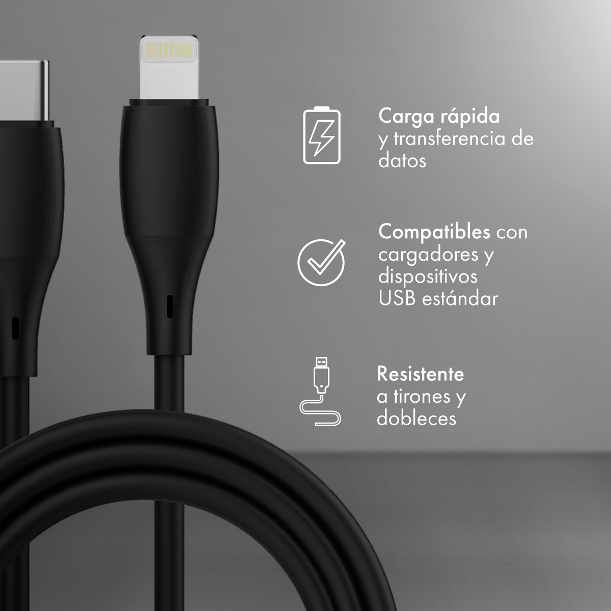 Su diseño reforzado brinda máxima durabilidad y evita cortes o dobleces, mientras que sus conectores metálicos de alta calidad garantizan una carga rápida y estable, además de una transmisión segura y eficiente.