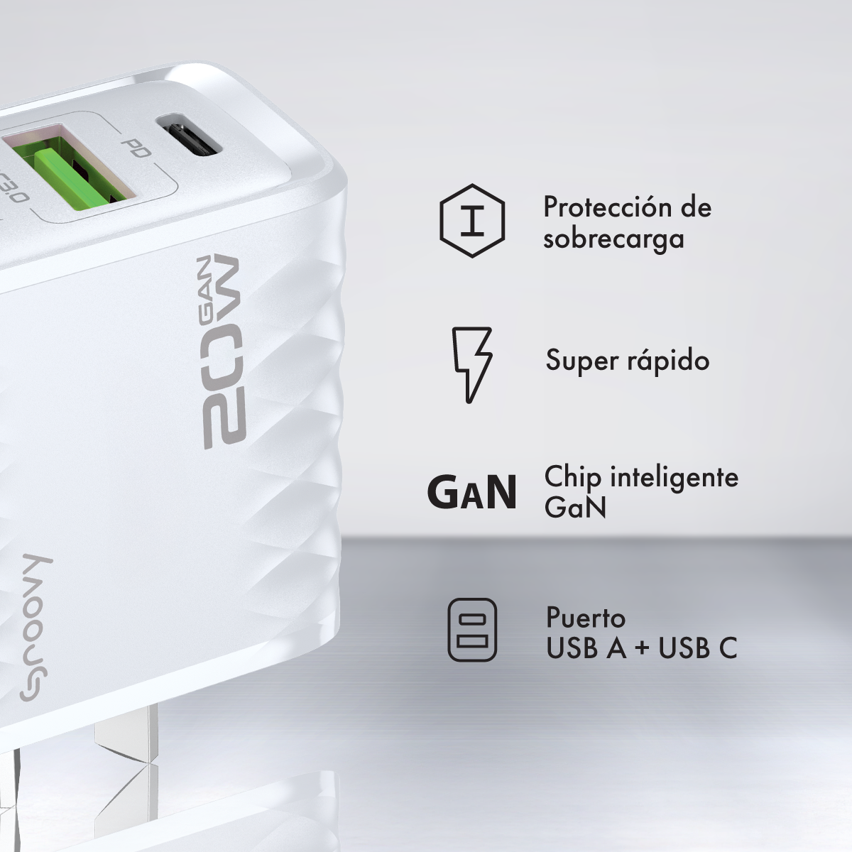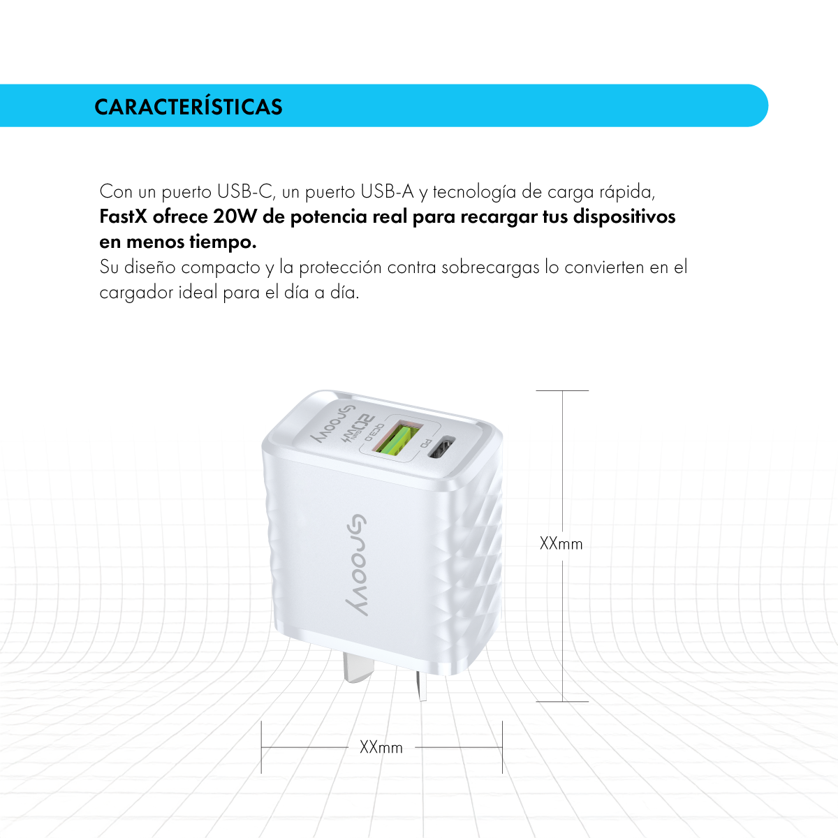 Con un puerto USB-C, un puerto USB-A y tecnología de carga rápida, FastX ofrece 20W de potencia real para recargar tus dispositivos en menos tiempo. Su diseño compacto y la protección contra sobrecargas lo convierten en el cargador ideal para el día a día.