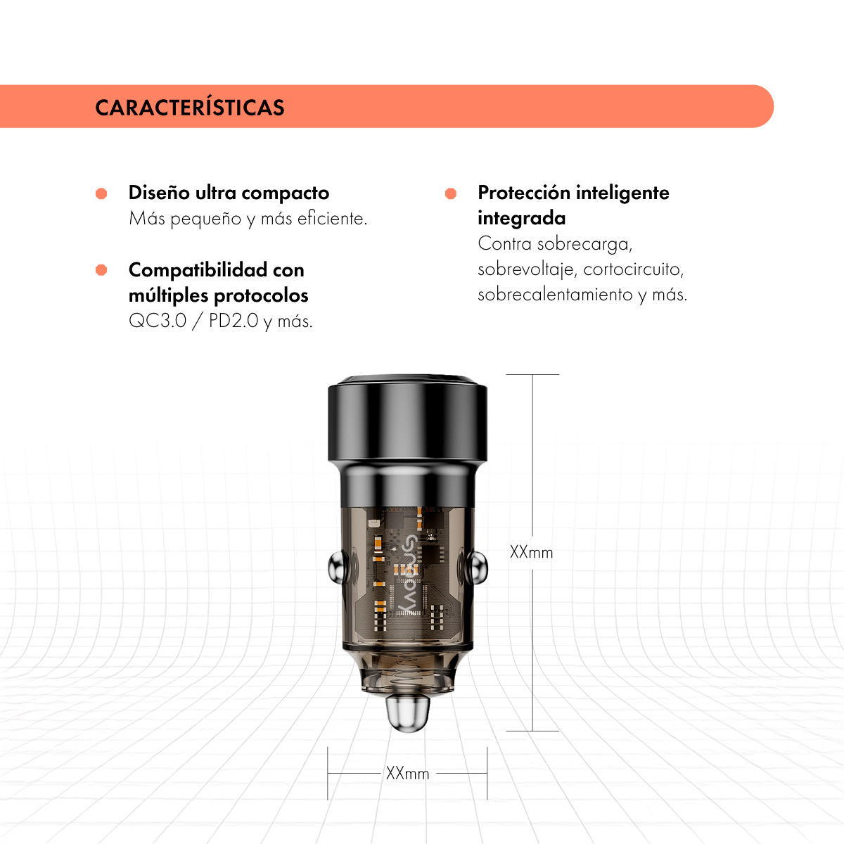 Su diseño ultra compacto de tercera generación es hasta 60 % más pequeño y más eficiente que los cargadores tradicionales, lo que lo hace discreto, moderno y fácil de transportar. Además, es apto para todo tipo de vehículos, desde autos hasta camiones, gracias a su entrada de 12V a 24V.