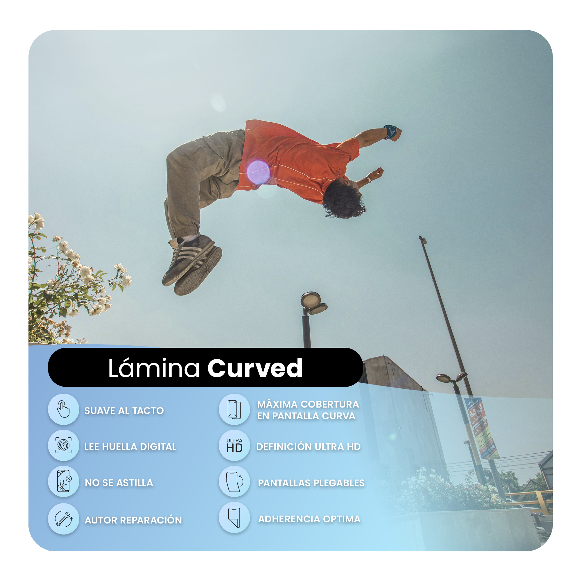 La lámina CURVED de Hydroglass ha sido especialmente diseñada para adaptarse a la perfección a pantallas curvas y plegables. Gracias a su mayor adhesión, la lámina se mantiene en su lugar sin importar las curvas o pliegues del dispositivo, brindando una protección sin igual ante impactos