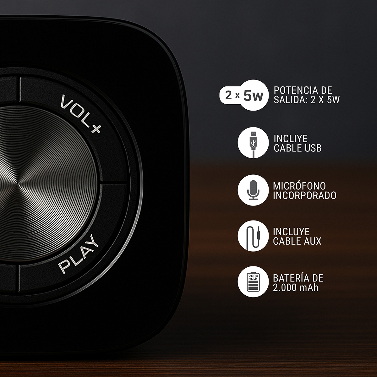 Con hasta 6 horas de autonomía, este parlante te ofrece tiempo de reproducción suficiente para disfrutar de tus listas de reproducción favoritas sin interrupciones. Su sistema de alimentación por USB asegura una carga rápida y eficiente, permitiéndote pasar más tiempo escuchando música y menos tiempo conectado a la corriente.