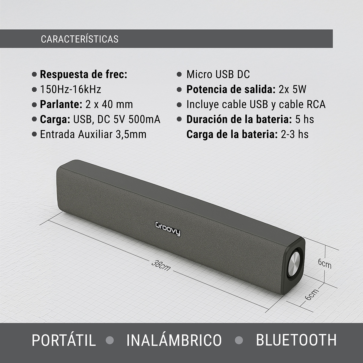 El parlante Bluetooth portátil Barra BT2610 de Groovy es la elección perfecta para quienes buscan calidad de sonido en cualquier lugar. Con su diseño compacto y elegante en color gris, se adapta a cualquier entorno, ya sea en casa, en el parque o en la playa. Su portabilidad te permite llevarlo fácilmente en tu mochila o maleta, asegurando que nunca te falte música en tus momentos de ocio.
